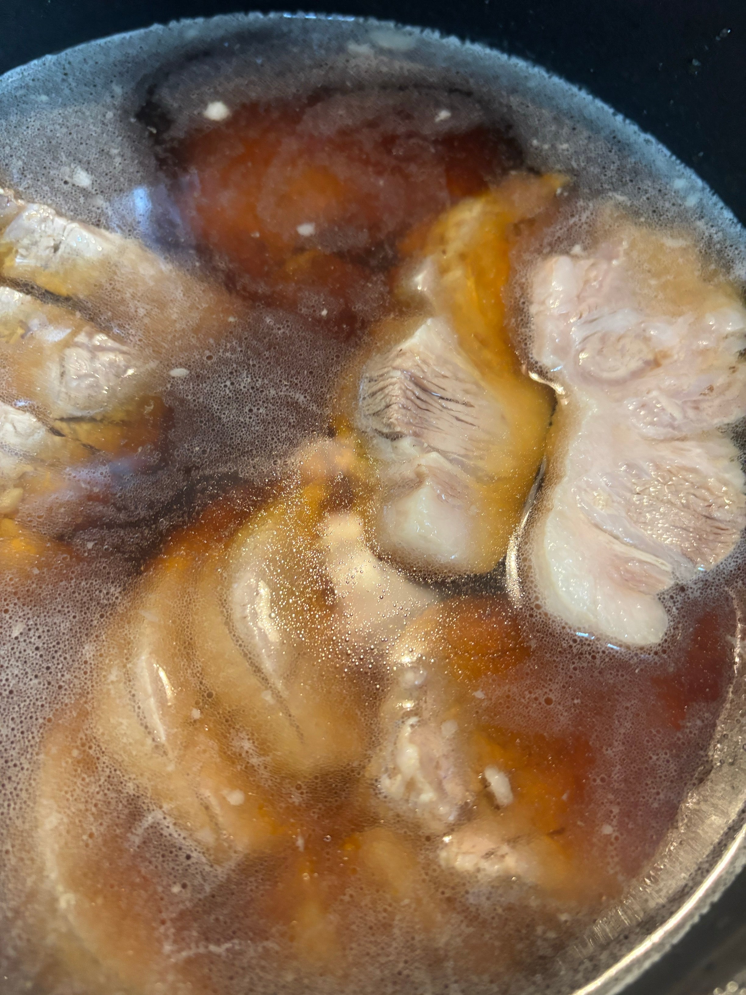Once boiled, remove the meat and cut into large pieces. Then, put 400cc Water, 200cc of cooking sake, 100cc of soy sauce, Ginger (about 3cm tube), 50cc Mirin (sweet cooking rice wine), 3 tablespoons sugar in a pot and boil for about 1 hour. You can also make boiled eggs if you like!