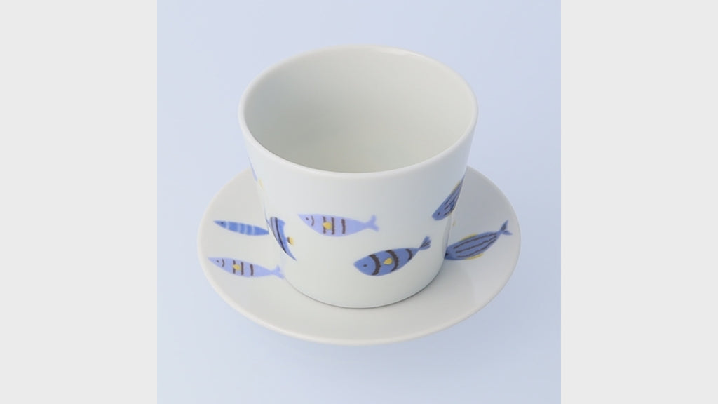 This cup and saucer features a design of a swimming fish.