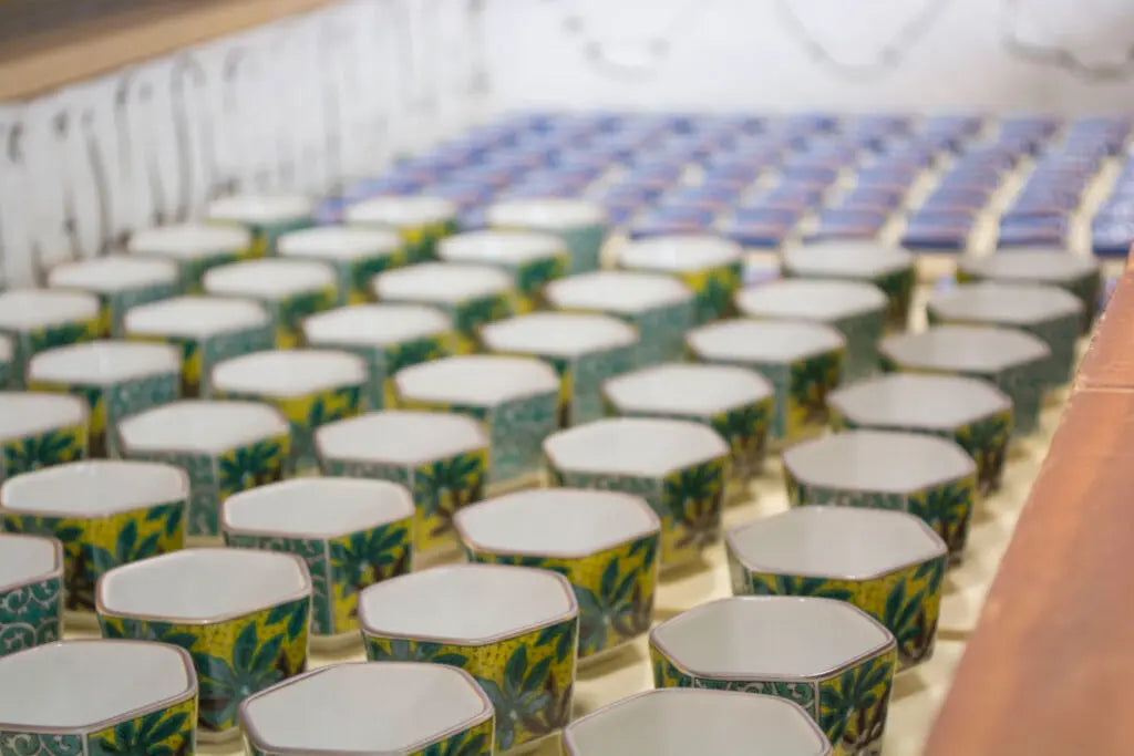 Using our original Japanese pigments as ink, the design is printed on transfer paper. The printed image on the transfer paper is then applied to the vessel and fired to complete the vessel. Compared to hand-painting, the process is said to be significantly less time-consuming and less expensive.