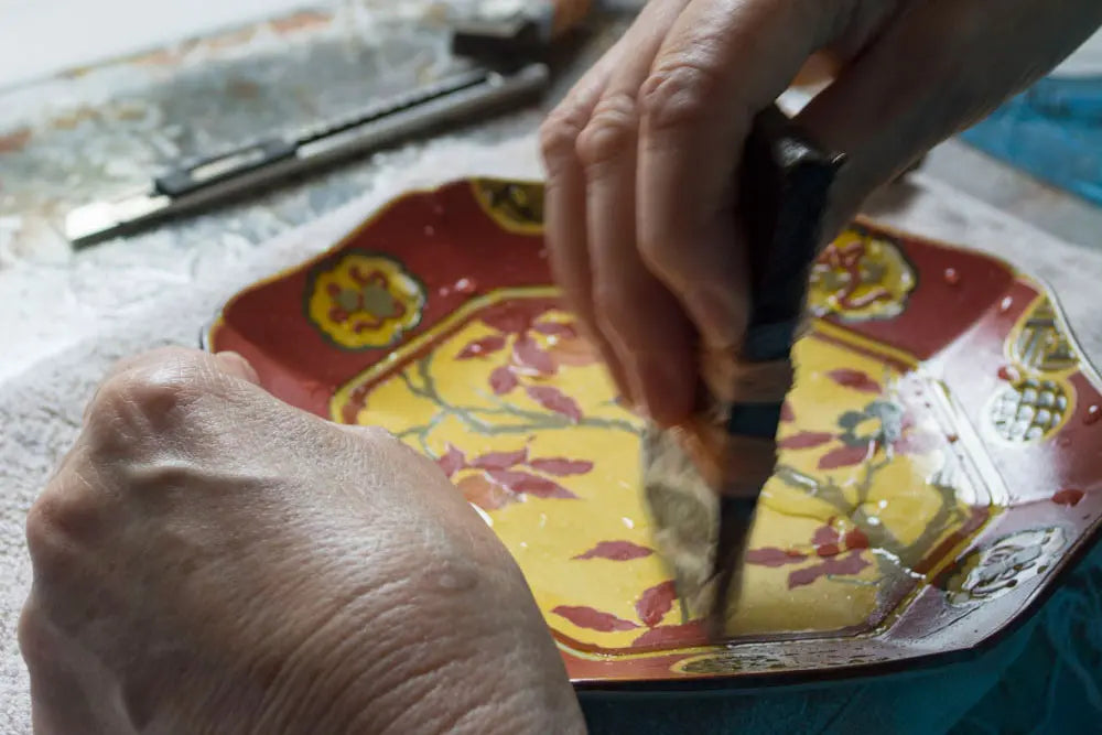 The spatula must be used skillfully so as not to damage the image, and so as not to cause the image to sag, but to hold it firmly in place. Exquisite strength is required. If the paper is not adhered in line with the shape of the vessel, the center may be off when viewed as a plate, or for a cup-shaped vessel, the overlap between the beginning and end of the transfer paper may not be aligned, causing the image to collapse. It requires a high level of skill to apply the transfer paper properly.