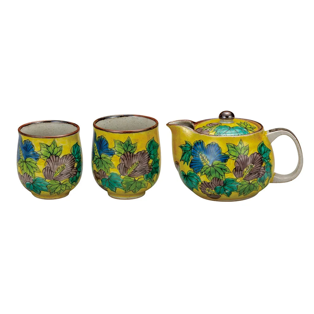 Kutani Yoshidaya Hibiscus Mutabilis Japanese Teapot and Tea Cup set